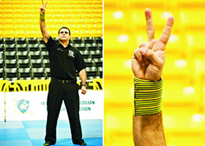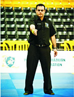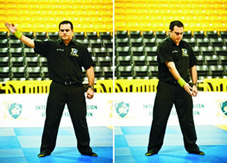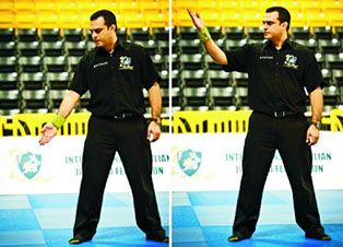 Indicate with extended arm the athlete who must stand up, followed by raising arm to shoulder height.